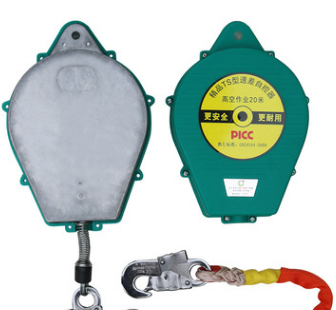 速差式防坠器是人体在高处作业时用来防止自身从高处坠落的防护装置,在作业过程中,它的上吊钩安装在挂点上,而缠绕在罩壳内部钢带上的织带或者是钢丝绳则会随着人体的自由而不断伸缩长度,由于防坠器的零部件中只有吊钩、罩壳及钢丝绳等,尤其是它的下吊钩无法直接和人体连接,因此必须依附于安全带的挂环上,才能真正起到良好的高空作业防护功效。