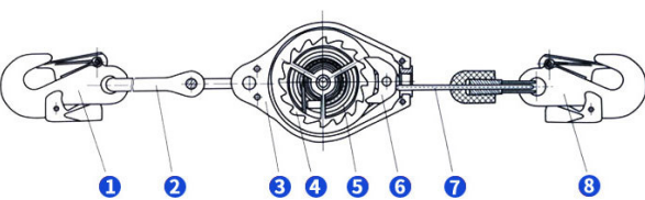 在速差防坠器处于待命状态和紧急保护状态时,以下这些基本结构均参与其中: